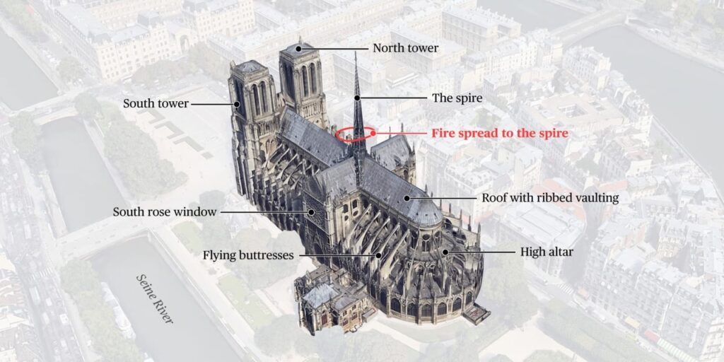 Though the risk of fire had been previously acknowledged, the speed of its spread was underestimated. Fire services had conducted regular drills at Notre Dame and even stationed a firefighter onsite daily. However, internal procedures and training were reportedly inadequate. A poorly labelled fire alarm system caused a critical delay: the initial guard sent to investigate went to the wrong location. By the time he reached the roof—climbing over 300 steps—the fire had already taken hold.
